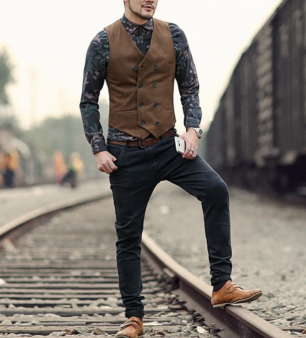 Oavsett om du klär upp dig för en sofistikerad vardagsoutfit eller vill satsa på ett autentiskt västerinspirerat utseende, förbättrar denna väst varje ensemble. Dess mångsidiga design och tidlösa stil gör den till en oumbärlig basvara i din herrgarderob, som passar både formella och informella tillställningar året runt.