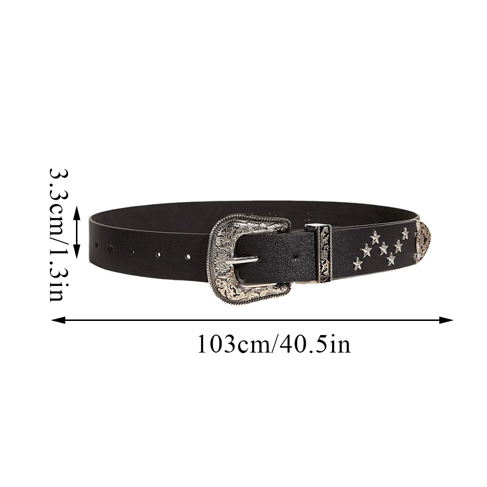 Tillverkat av högkvalitativt imitationläder kombinerar detta bälte både hållbarhet och stilrena detaljer. Med en bredd på 3,3 cm och en längd på 103 cm erbjuder bältet en flexibel passform som funkar lika bra till jeans, kjolar eller klänningar. Oavsett om du väljer den stjärnnitade designen för en modern twist eller den klassiska nitatdesignen för en mer traditionell westernlook, är detta bälte det perfekta valet för att lyfta din outfit vid allt ifrån countrykonserter till vardagsäventyr.