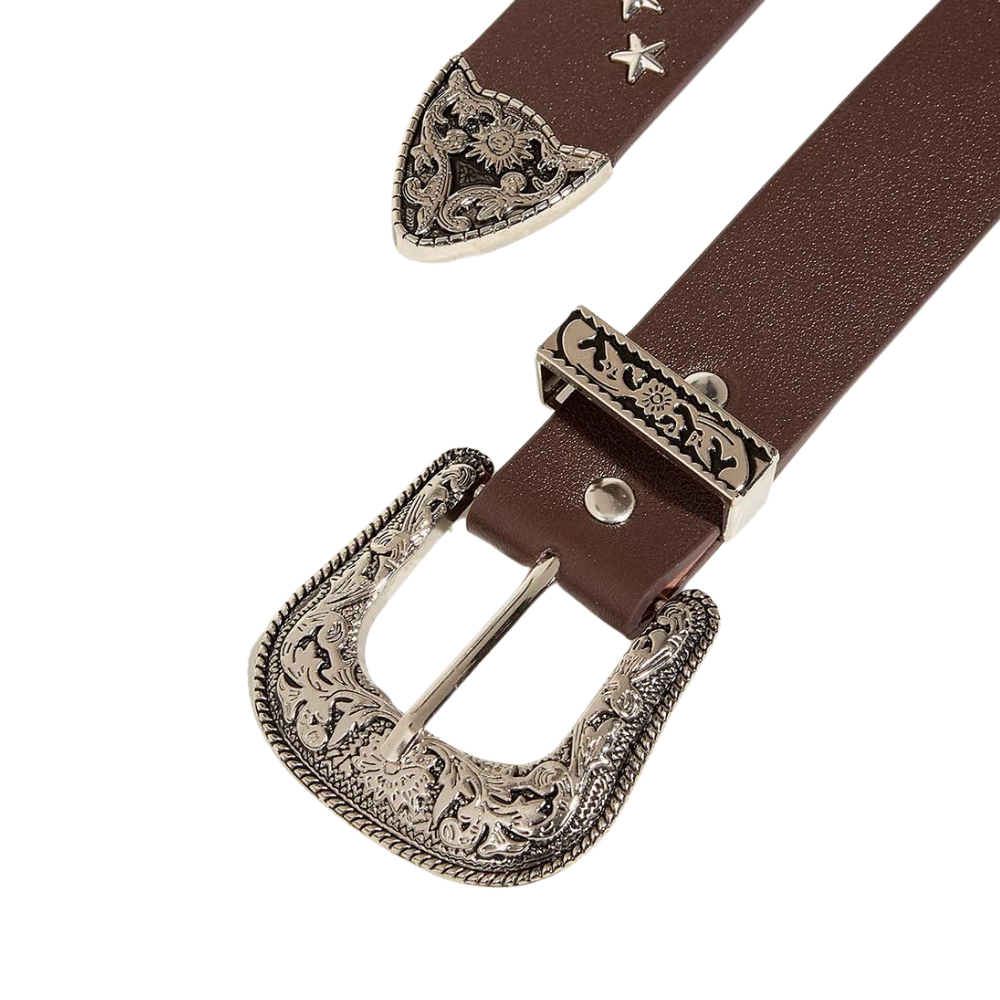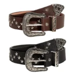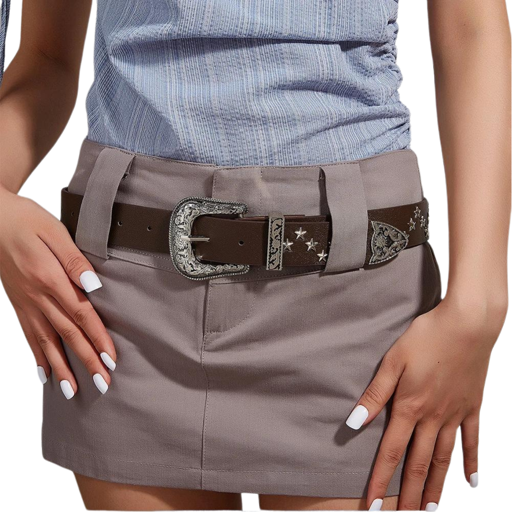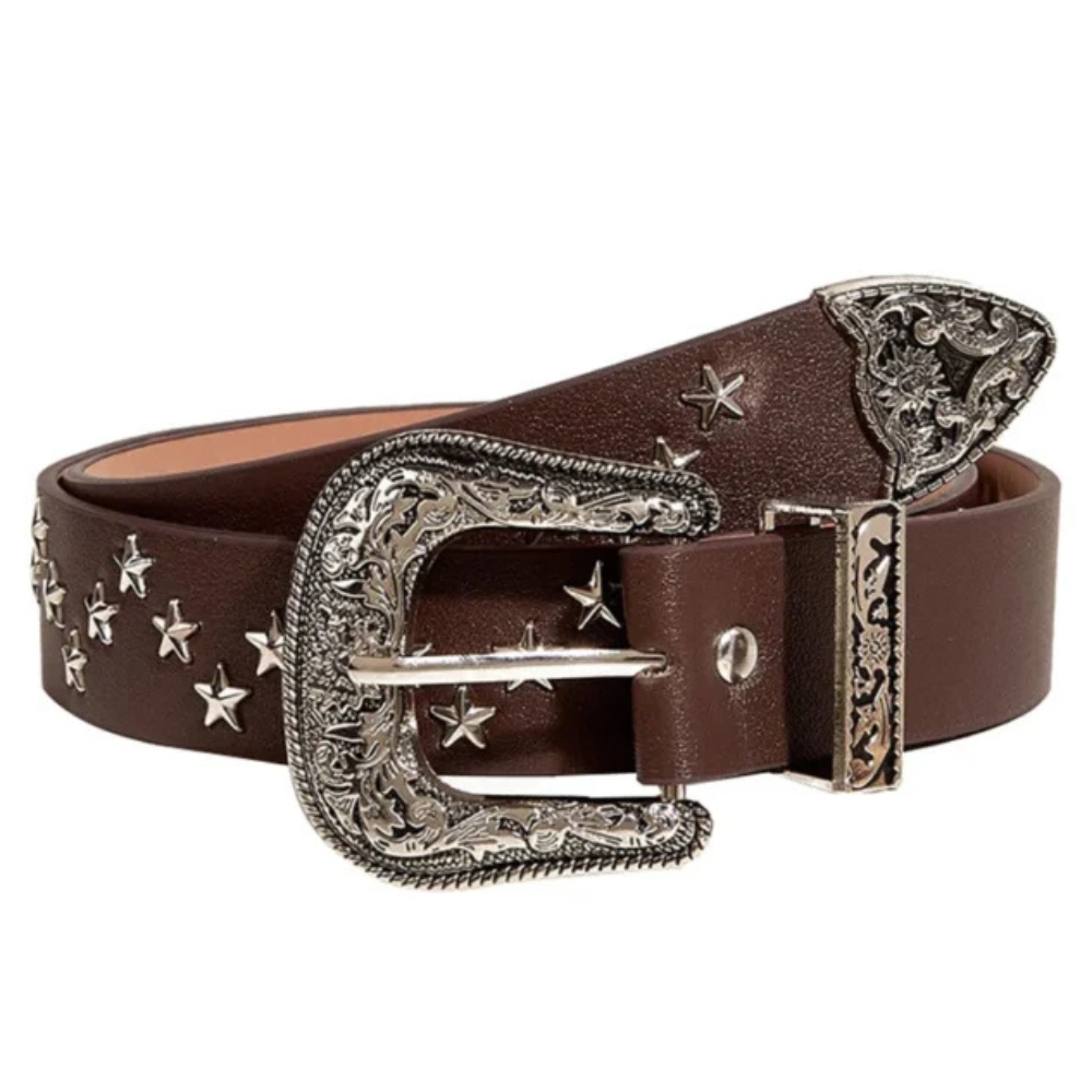 Upplev äkta westernkänsla med vårt exklusiva Kvinnors western nitat läderbälte, designat för att ge din garderob en mix av tidlös elegans och modern djärvhet. Bältet finns i två unika varianter – en med stjärnformade nitar för en lekfull och iögonfallande look, samt en med traditionella nitar som framhäver den autentiska westernestetiken. Det detaljerade vintageinspirerade spännet, som är tillverkat i legering med intrikata gravyrer, förhöjer bältets karaktär och tillför en extra touch av westernarv i din stil.